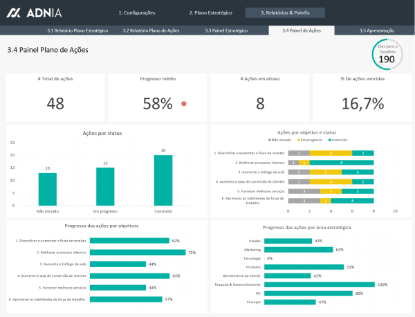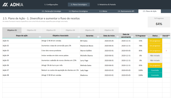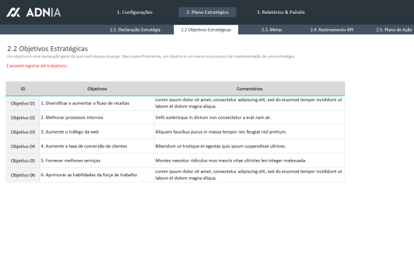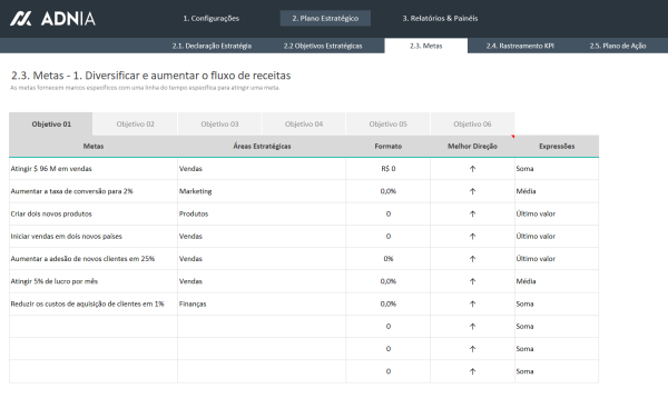 A meta da Planilha de Planejamento Estratégico vai além do gerenciamento regular: ela visa transformar a visão estratégica em resultados tangíveis e perceptíveis em toda a empresa. A Planilha de Planejamento Estratégico é a aliada perfeita na tomada de decisões de gerenciamento, fornecendo dados concretos e abrangentes para basear suas escolhas.